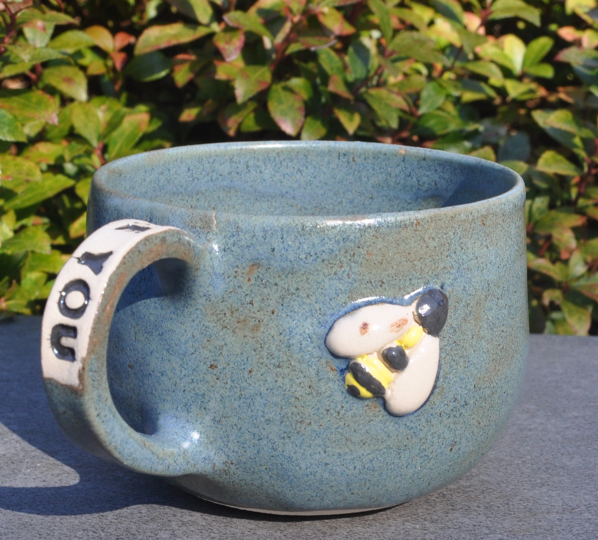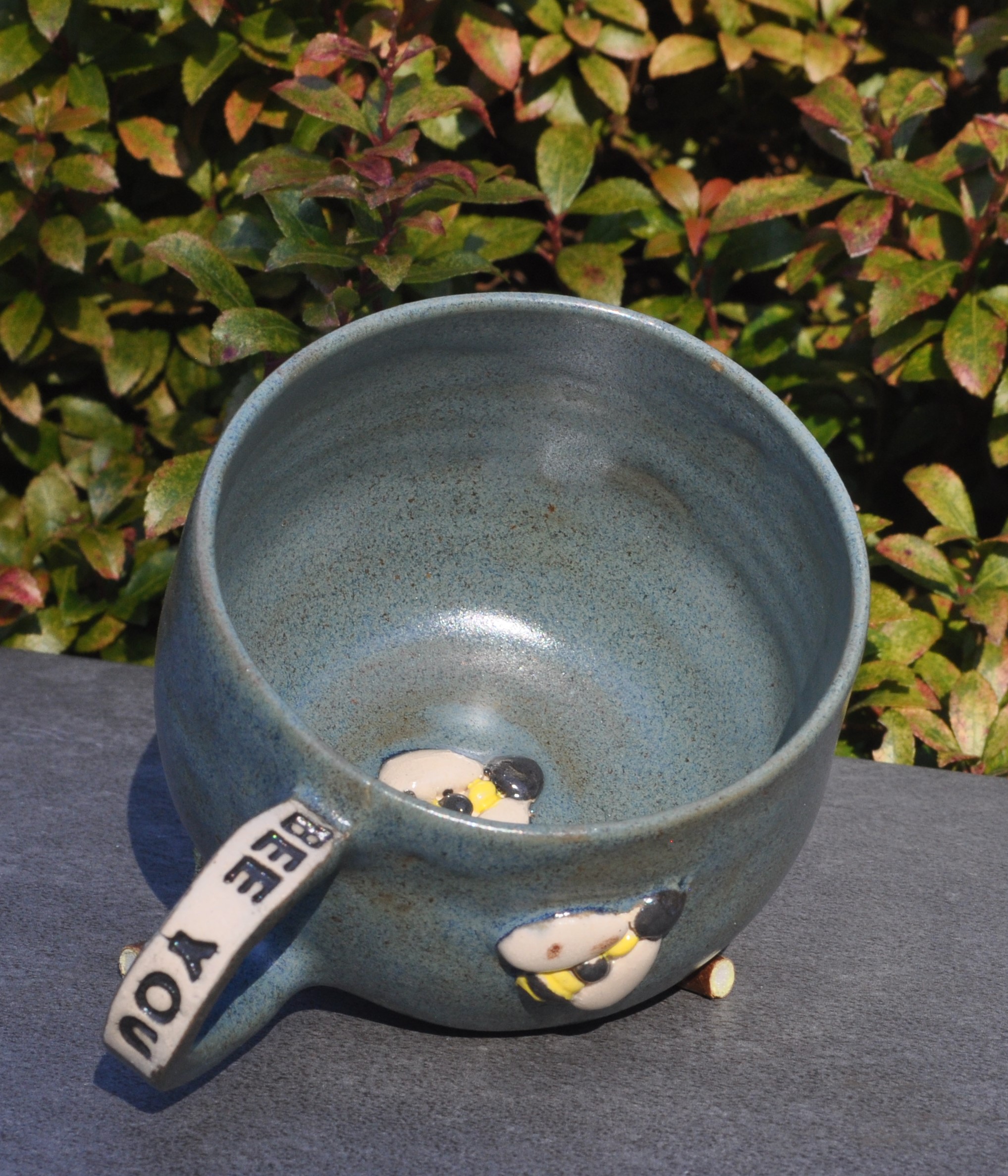 Stentøjskop med hank i blå nistret glasur, “Bee you” på hanken, samt bi uden på og indei.