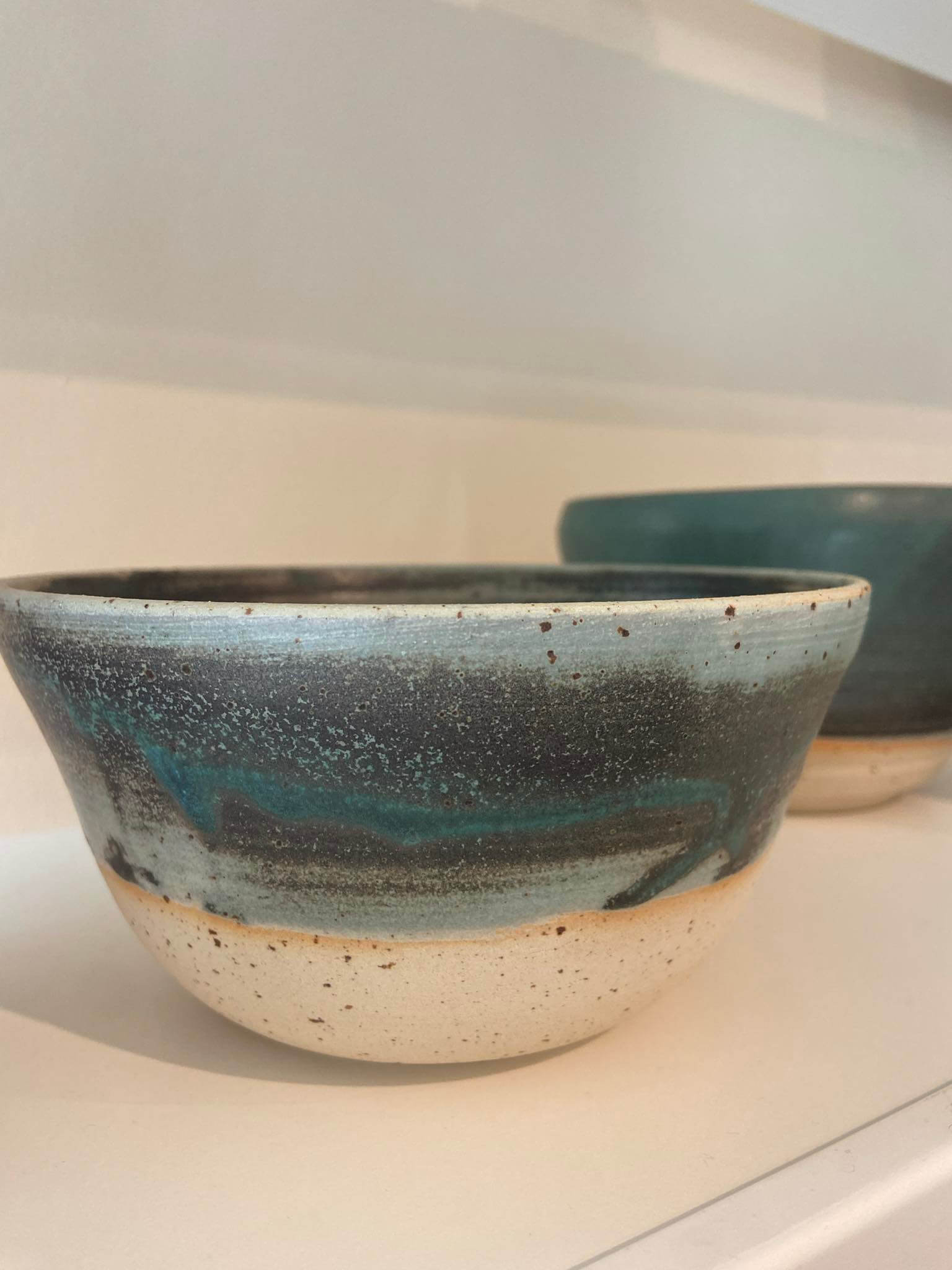 Smuk hånddrejet skål i en mat grønlig glasur.