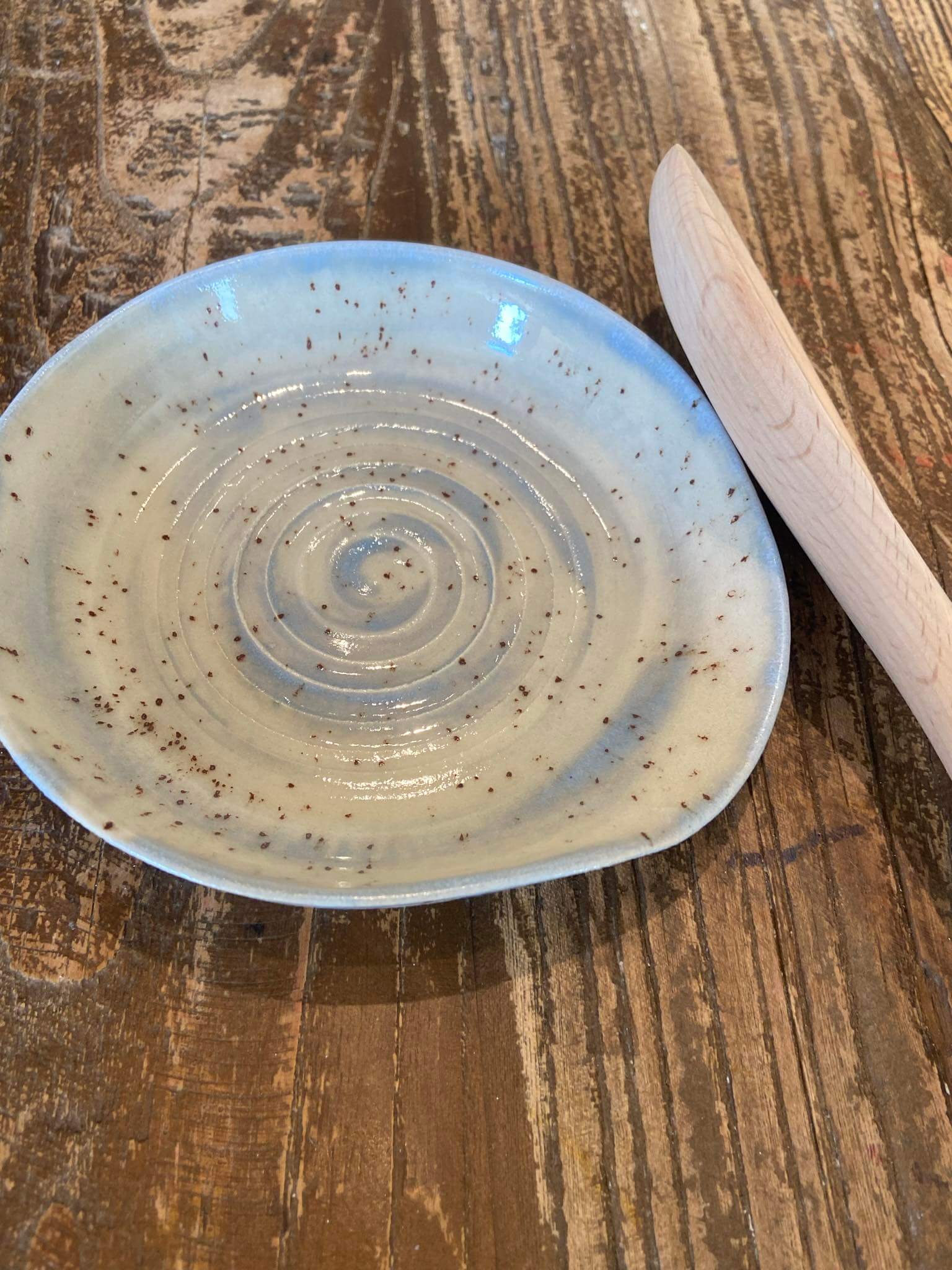 Spoonrest i lys creme nistret glasur med lysblå effekt inkl træske.